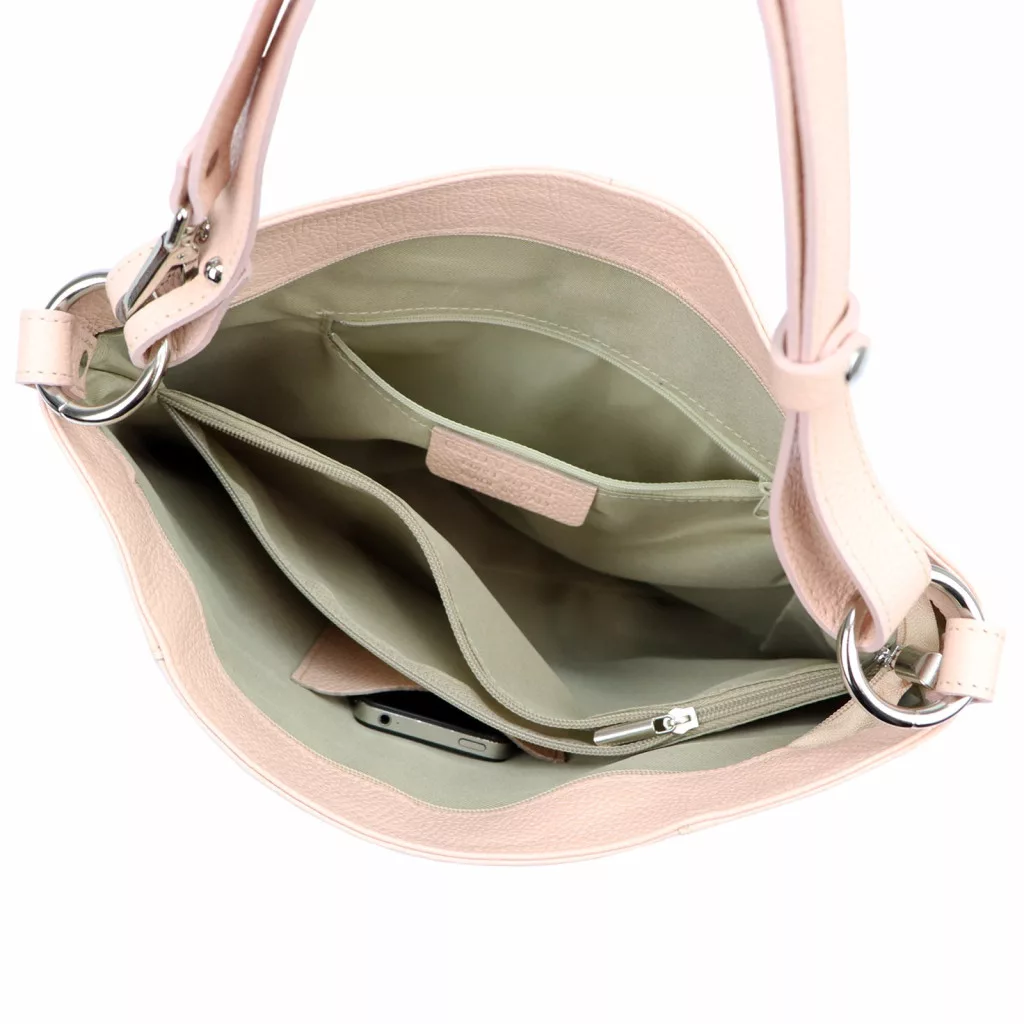 Klasszikus, nőies és elegáns megjelenés. A púder árnyalatú marhabőr, a praktikus méret és az átgondolt zsebkialakítás harmonikus összhangot alkot, amely stílusos és jól használható oldaltáskát eredményez a mindennapokra.
