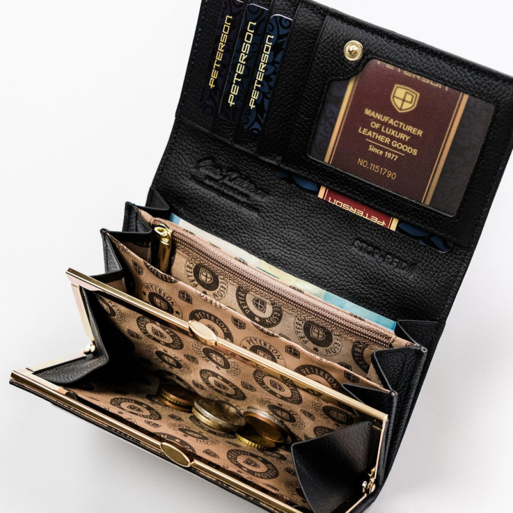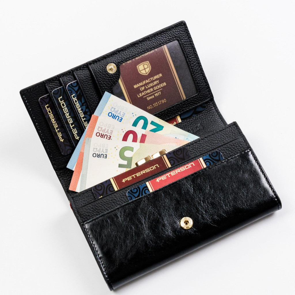 A Peterson PTN ST-466 fekete női bőr pénztárca 15,5 x 9 x 3 cm tökéletes választás azok számára, akik az eleganciát, a praktikusságot és az időtálló stílust keresik egyetlen kiegészítőben.