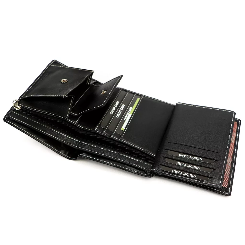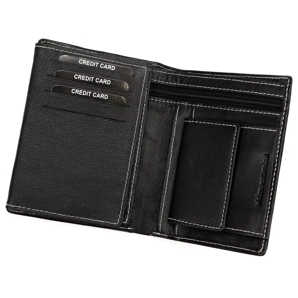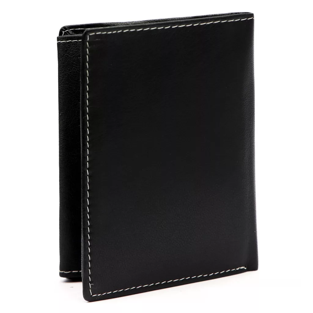 Elegantný, no zároveň výrazný vzhľad čiernej pánskej peňaženky Money Kepper je daný lesklým, mäkká pravá koža, ktorá vyžaruje kvalitu a sofistikovaný štýl. Klasický čierny povrch je charakterizovaný bielym ozdobným prešívaním pozdĺž okrajov, ktoré vytvára čistý a elegantný kontrast s nadčasovým dizajnom. stojaci štýlmá praktický dizajn, vhodný na každodenné použitie a zároveň poskytuje sofistikovaný vzhľad.