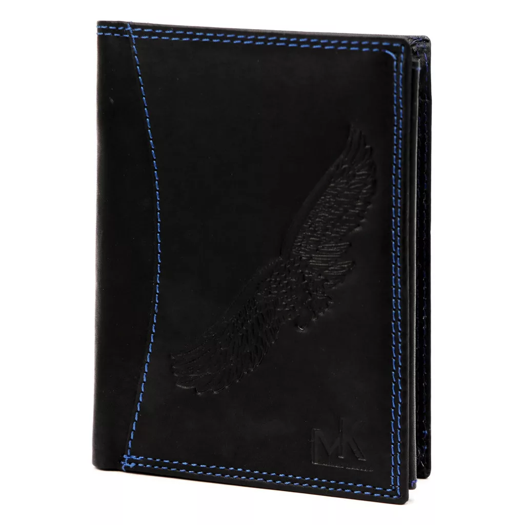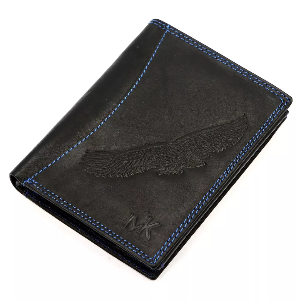A Money Kepperje černoch. Moderný, výrazný vzhľad peňaženky z hovädzej kože je skutočne výnimočný vďaka štýlovému modrému ozdobnému prešívaniu. Motív orla na prednej strane symbolizuje silu a slobodu, zatiaľ čo kontrastné modré prešívanie dodáva klasickej čiernej koži svieži, športový a elegantný charakter. Pravá hovädzia koža je odolná a príjemná na dotyk, vďaka čomu je peňaženka dlhodobo spoľahlivým spoločníkom v každodennom živote.