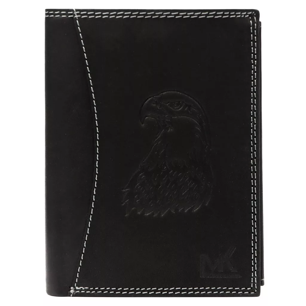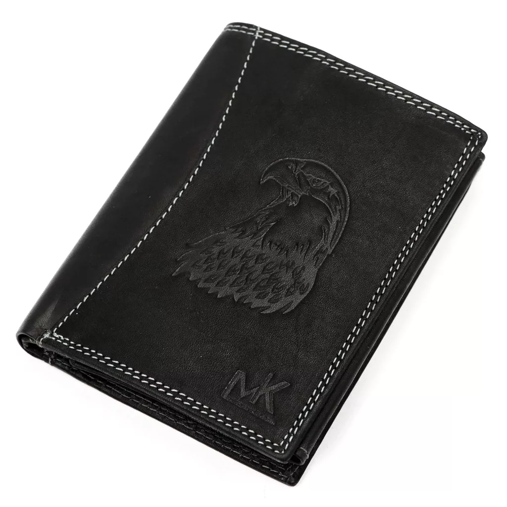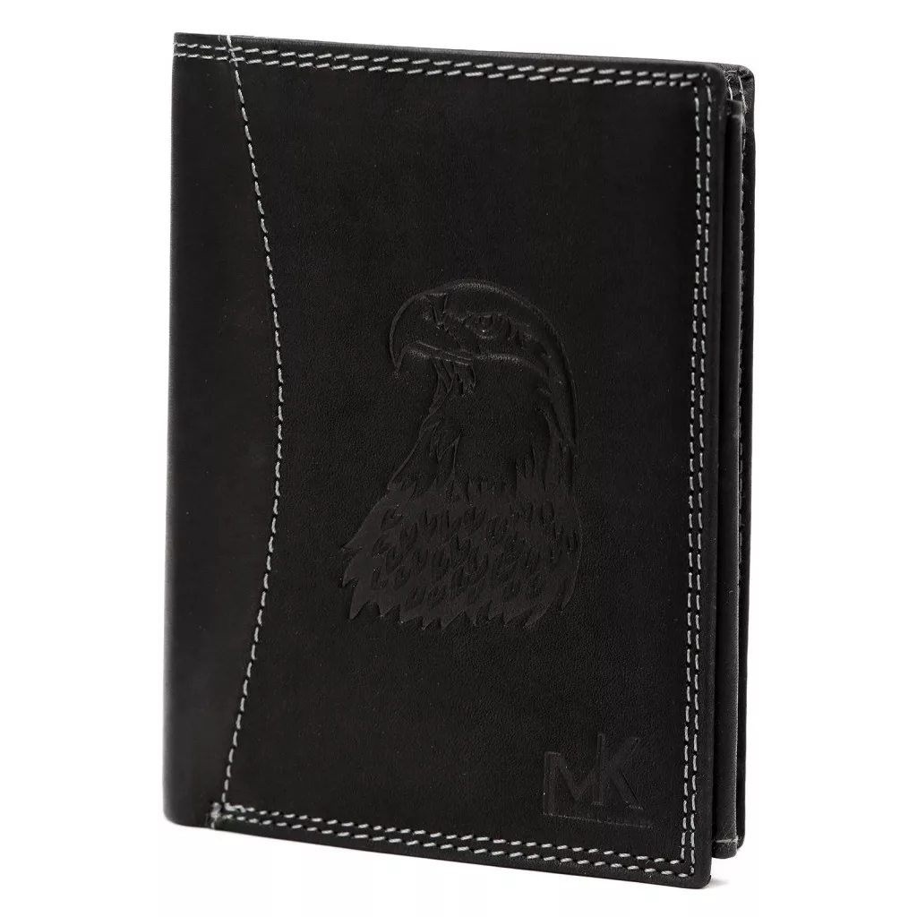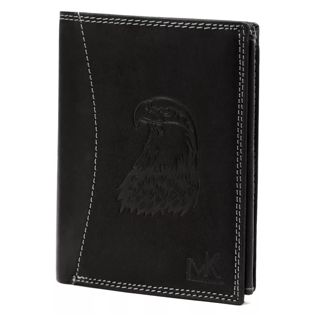 Čierna pánska peňaženka Money Kepper z hovädzej kože má čistý a výrazný vzhľad s kontrastným bielym ozdobným prešívaníma motívom orlana prednej strane. Jemné prešívanie dodáva klasickej čiernej koži moderný, športový a elegantný akcent, zatiaľ čo orol symbolizuje silu, slobodu a sebavedomie. Pravá hovädzia koža je odolný a zároveň príjemný materiál na dotyk, vďaka čomu je peňaženka spoľahlivým spoločníkom v každodennom živote z dlhodobého hľadiska.