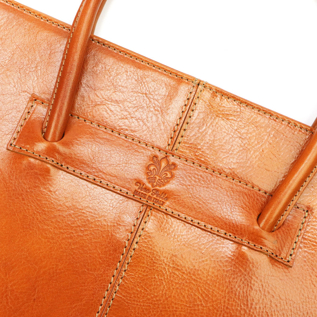 Taška je vyrobená z prvotriednej, hodvábne lesklej hovädzej kože. Jej hladký, jemne lesklý povrch vyžaruje eleganciu, zatiaľ čo prírodná koža zaisťuje odolnosť a nadčasovú kvalitu. Podľa feng shui sa koňakovo hnedá farba spája s elementom zeme, symbolom stability, bezpečia a spoľahlivosti. Jej teplý tón dodáva vyvážený, sebavedomý vzhľad a zároveň taške dodáva klasický, obchodný charakter. Reliéfne logo značky pôsobí ako diskrétny detail a nitovaná základňa chráni tašku, keď je položená na zemi.