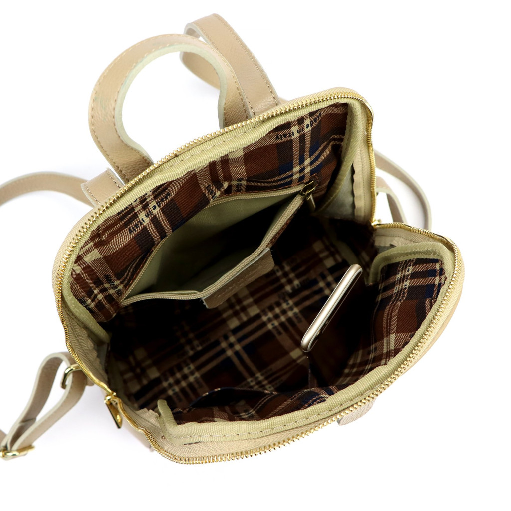 Średniej wielkości plecak z naturalnej, miękkiej włoskiej skóry. Plecak ma budowę jednokomorową, wykończoną trwałą podszewką, wyposażoną w kieszonkę zapinaną na suwak i kieszeń na telefon. Całość zamykana jest dwusuwakowym zamkiem błyskawicznym. Na froncie plecaka znajduje się jeszcze pionowa, zapinana suwakiem, kieszonka. Z tyłu wszyto jeszcze jedną dodatkową kieszonkę.