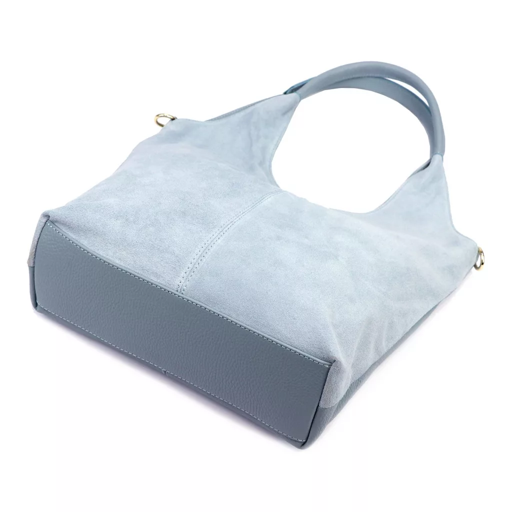 A táska prémium minőségű velúr marhabőrből készült, amely puha tapintású és természetes, elegáns megjelenést biztosít. A bőrt kizárólag természetes növényi és ásványi eredetű cserzőanyagokkal és festékekkel kezelték. A kék szín a feng shui szerint a nyugalom, a bölcsesség és a harmónia jelképe. Mély, elegáns árnyalata kiegyensúlyozott és kifinomult megjelenést ad a táskának.