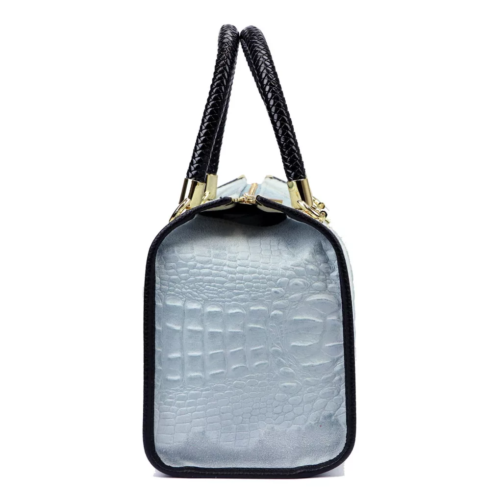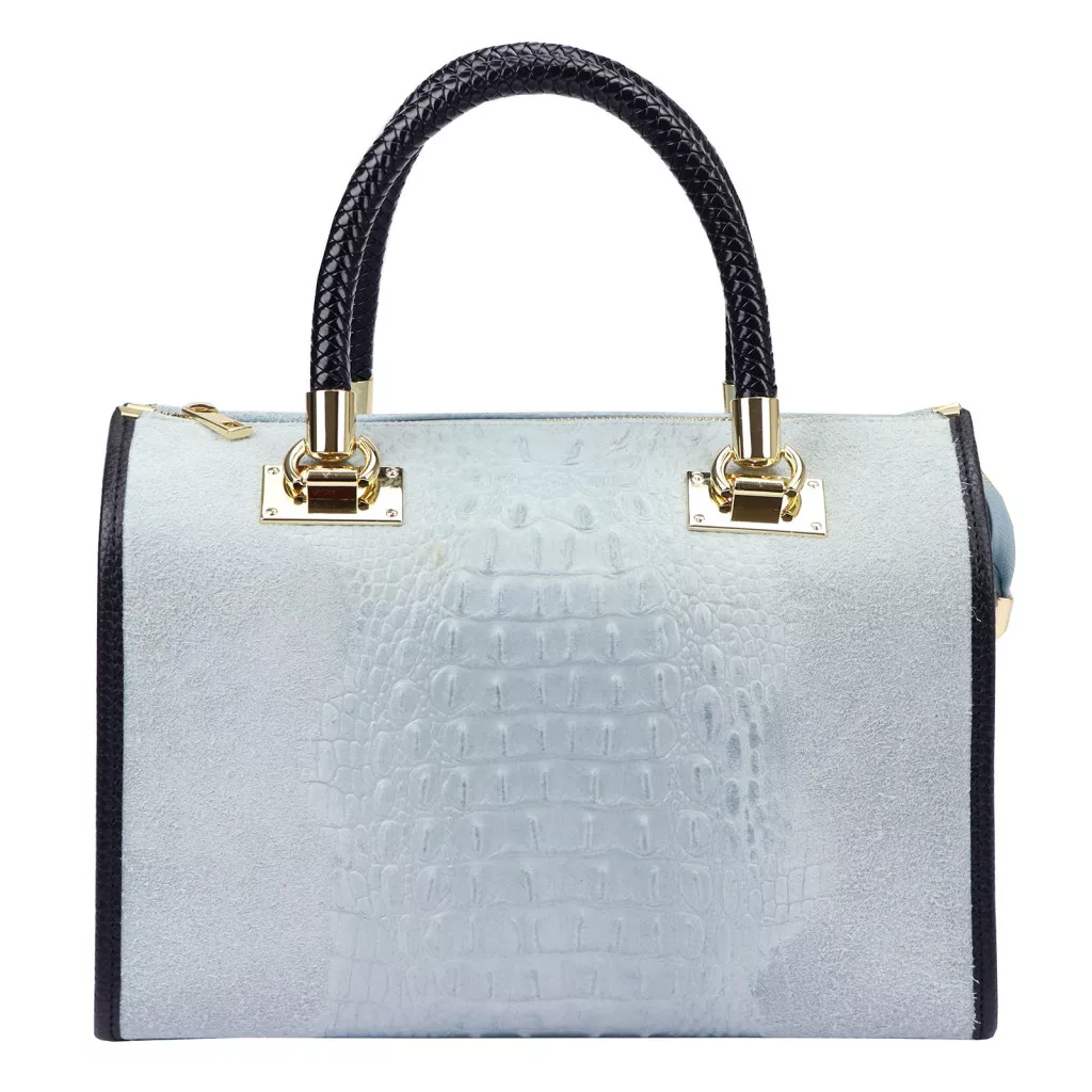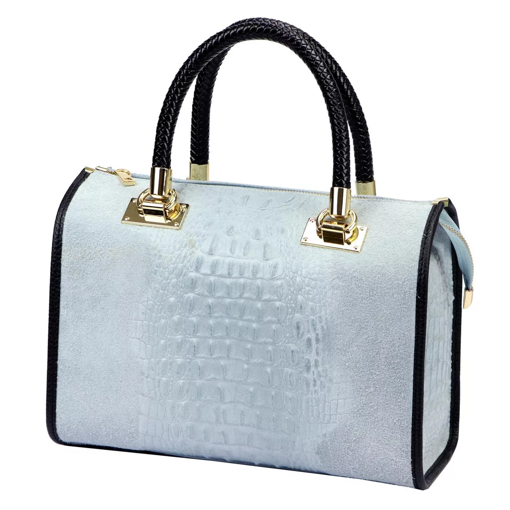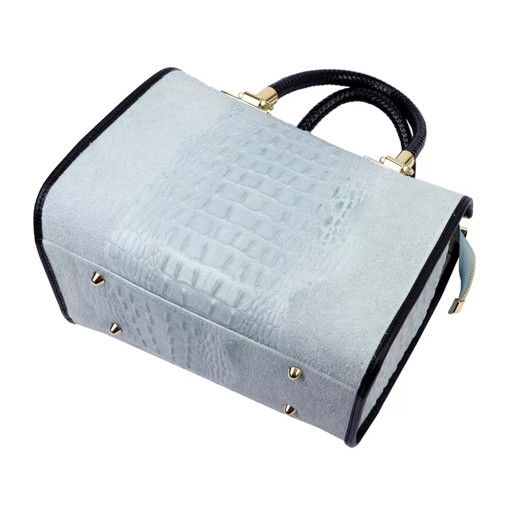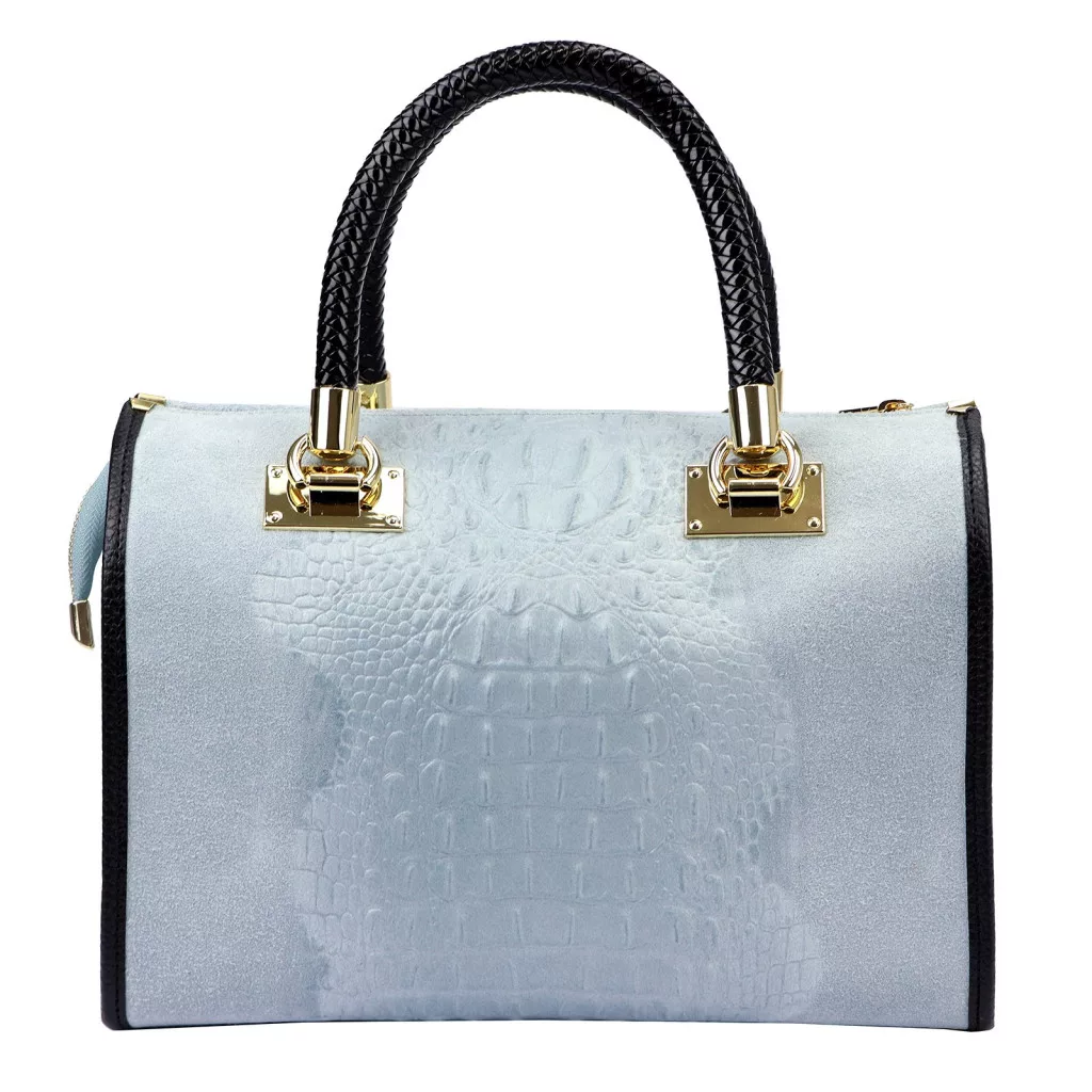 Elegáns, nőies és kifinomult megjelenés. A strukturált kufer forma, a krokodil mintázatú részletek és a babakék árnyalat luxus hatású, mégis könnyed karaktert ad a táskának, amely tökéletes választás a stílusos mindennapokhoz.