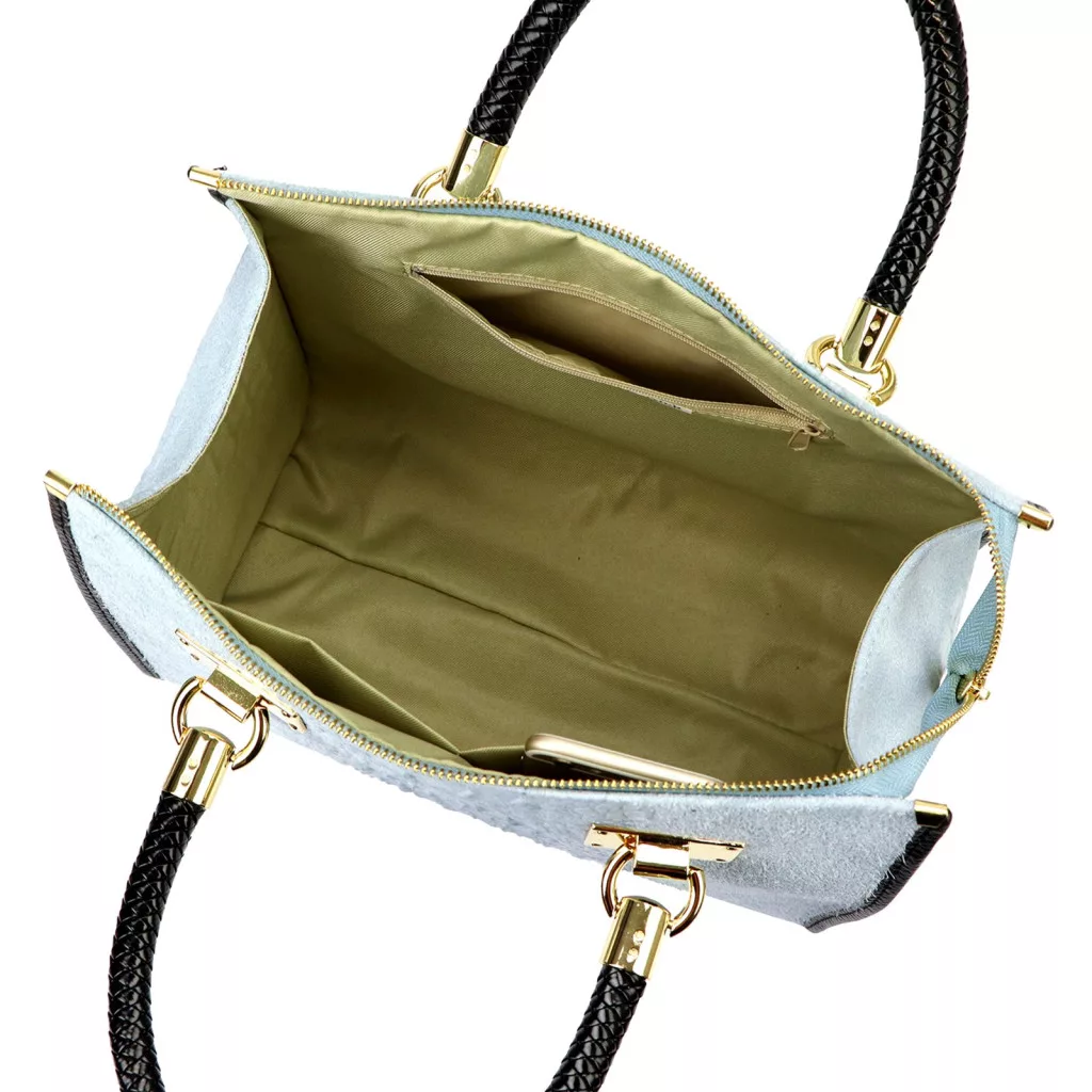 A táska prémium minőségű, olasz velúr marhabőrből készült, amely puha tapintású és elegáns megjelenést biztosít. A felület egyes részein krokodilbőr mintázatú dombornyomás jelenik meg, amely különleges textúrát és luxus hatást kölcsönöz a táskának. A babakék szín a feng shui szerint a nyugalom, a tisztaság és a harmónia jelképe. Világos, friss árnyalata könnyed és kifinomult megjelenést ad a táskának.