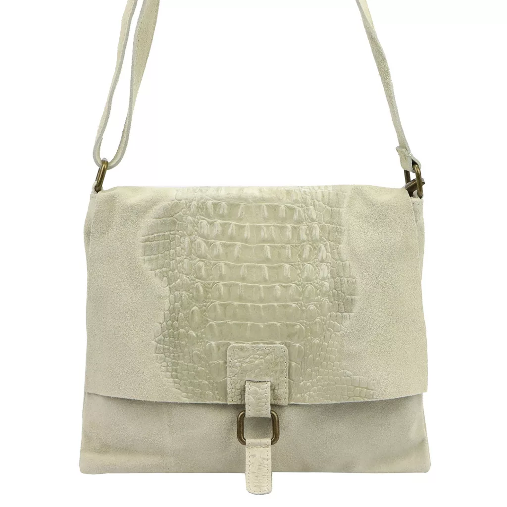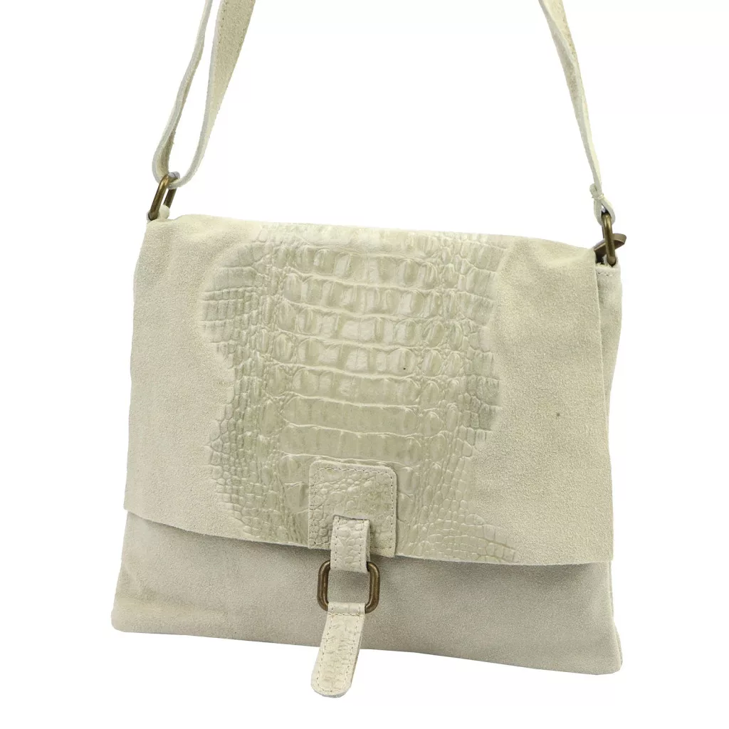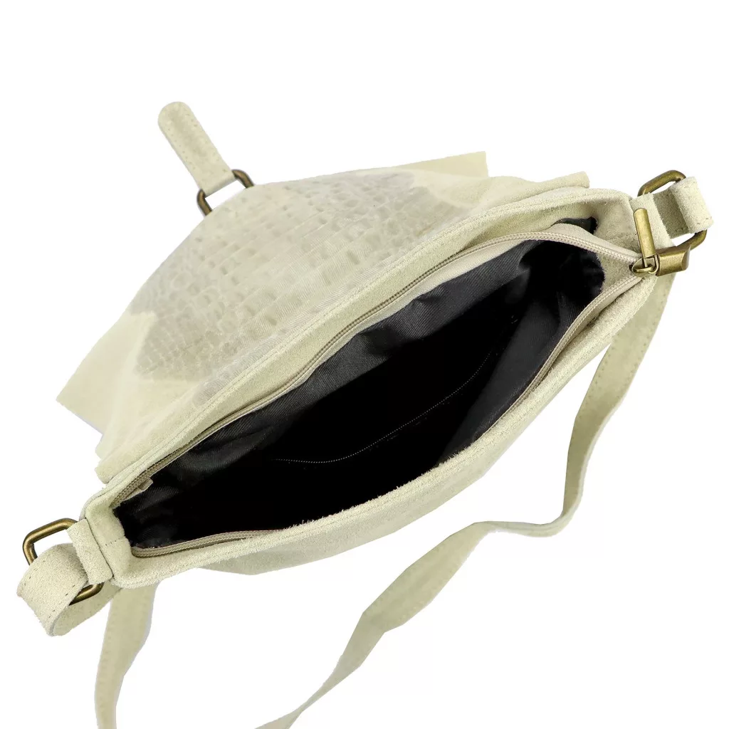 Nieduża torebka-listonoszka z najwyższej jakości, włoskiej, naturalnej skóry zamszowej. Skóra wyprawiana i barwiona wyłącznie naturalnymi garbnikami i barwnikami pochodzenia roślinnego i mineralnego. Na klapie torebki wytłoczono wzór skóry krokodyla. Torebka ma budowę jednokomorową, wykończoną trwałą podszewką, wyposażoną w kieszonkę zapinaną na suwak. Całość zamykana jest zamkiem błyskawicznym i klapą z zatrzaskiem magnetycznym. Długi pasek pozwala wygodnie nosić ją na ramieniu lub na ukos przez pierś.