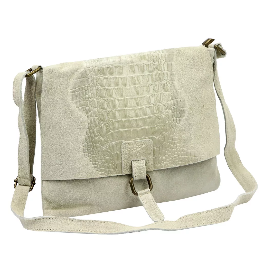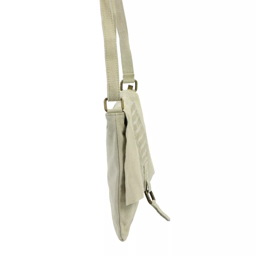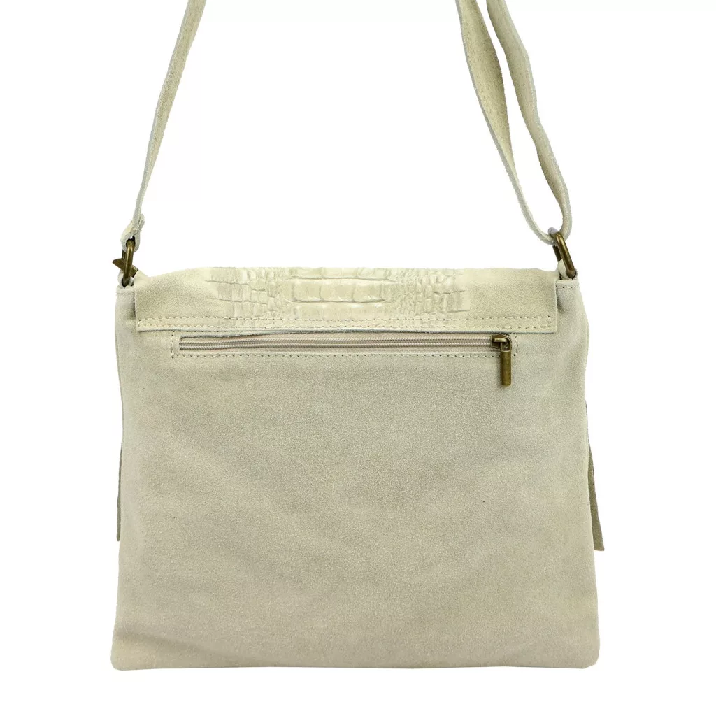 Nieduża torebka-listonoszka z najwyższej jakości, włoskiej, naturalnej skóry zamszowej. Skóra wyprawiana i barwiona wyłącznie naturalnymi garbnikami i barwnikami pochodzenia roślinnego i mineralnego. Na klapie torebki wytłoczono wzór skóry krokodyla. Torebka ma budowę jednokomorową, wykończoną trwałą podszewką, wyposażoną w kieszonkę zapinaną na suwak. Całość zamykana jest zamkiem błyskawicznym i klapą z zatrzaskiem magnetycznym. Długi pasek pozwala wygodnie nosić ją na ramieniu lub na ukos przez pierś.