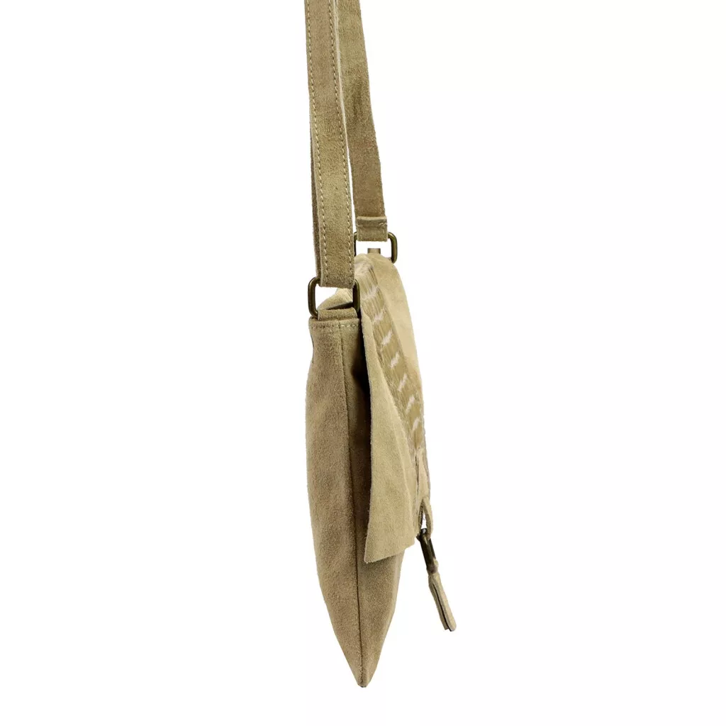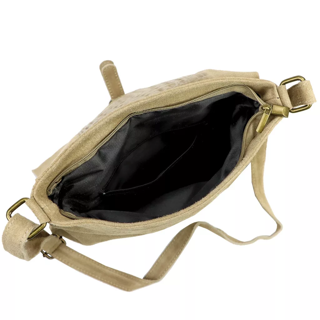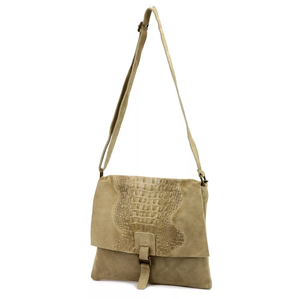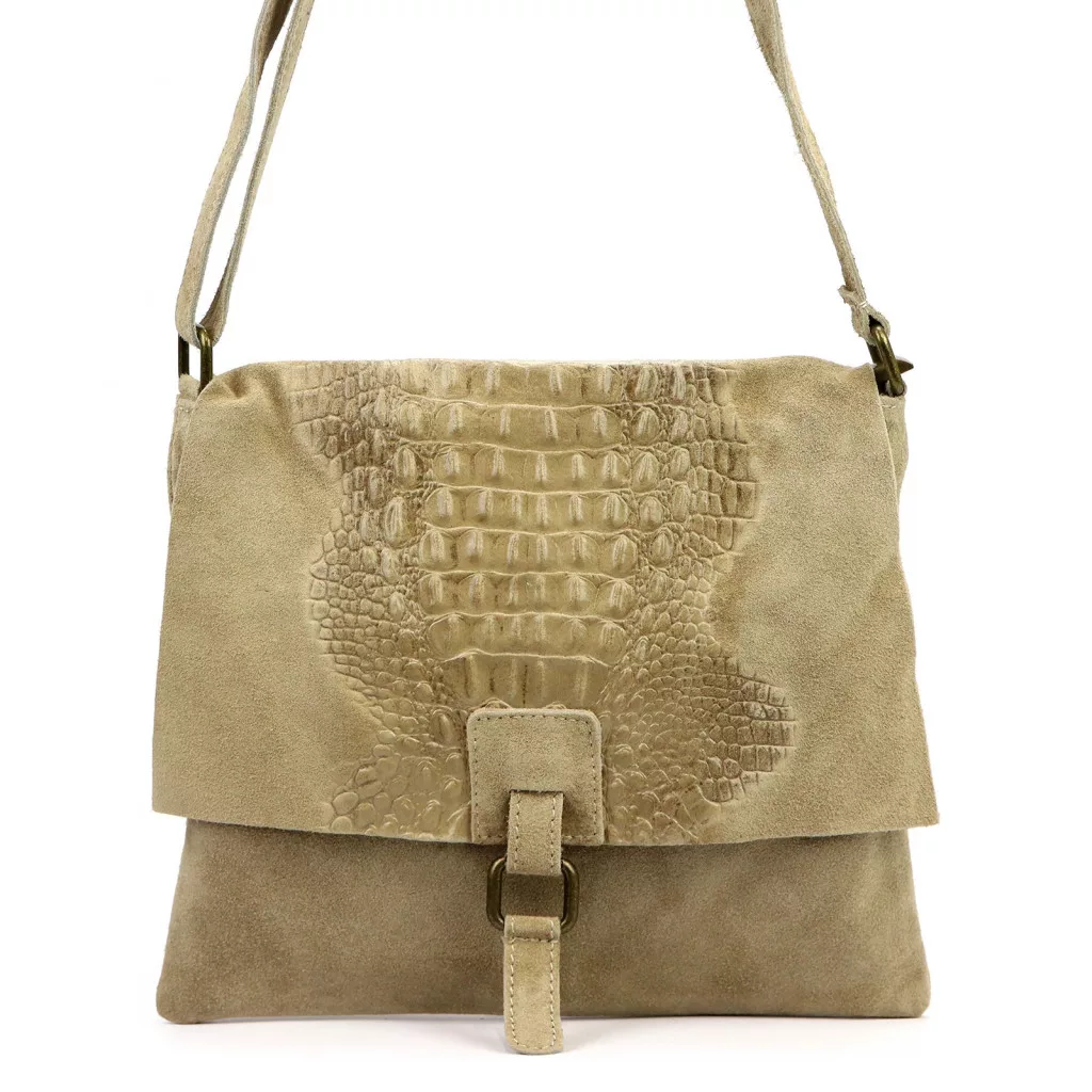 Nieduża torebka-listonoszka z najwyższej jakości, włoskiej, naturalnej skóry zamszowej. Skóra wyprawiana i barwiona wyłącznie naturalnymi garbnikami i barwnikami pochodzenia roślinnego i mineralnego. Na klapie torebki wytłoczono wzór skóry krokodyla. Torebka ma budowę jednokomorową, wykończoną trwałą podszewką, wyposażoną w kieszonkę zapinaną na suwak. Całość zamykana jest zamkiem błyskawicznym i klapą z zatrzaskiem magnetycznym. Długi pasek pozwala wygodnie nosić ją na ramieniu lub na ukos przez pierś.