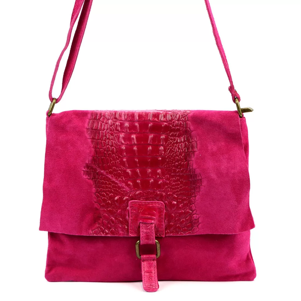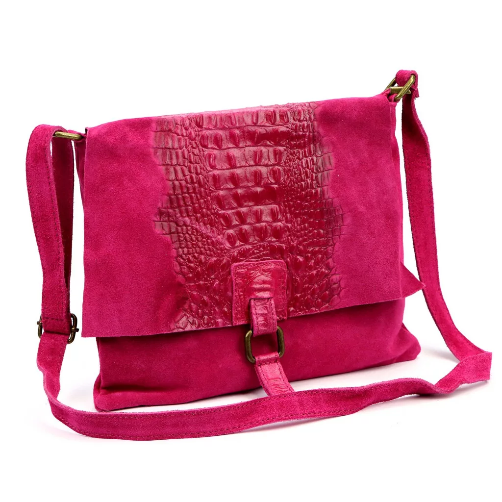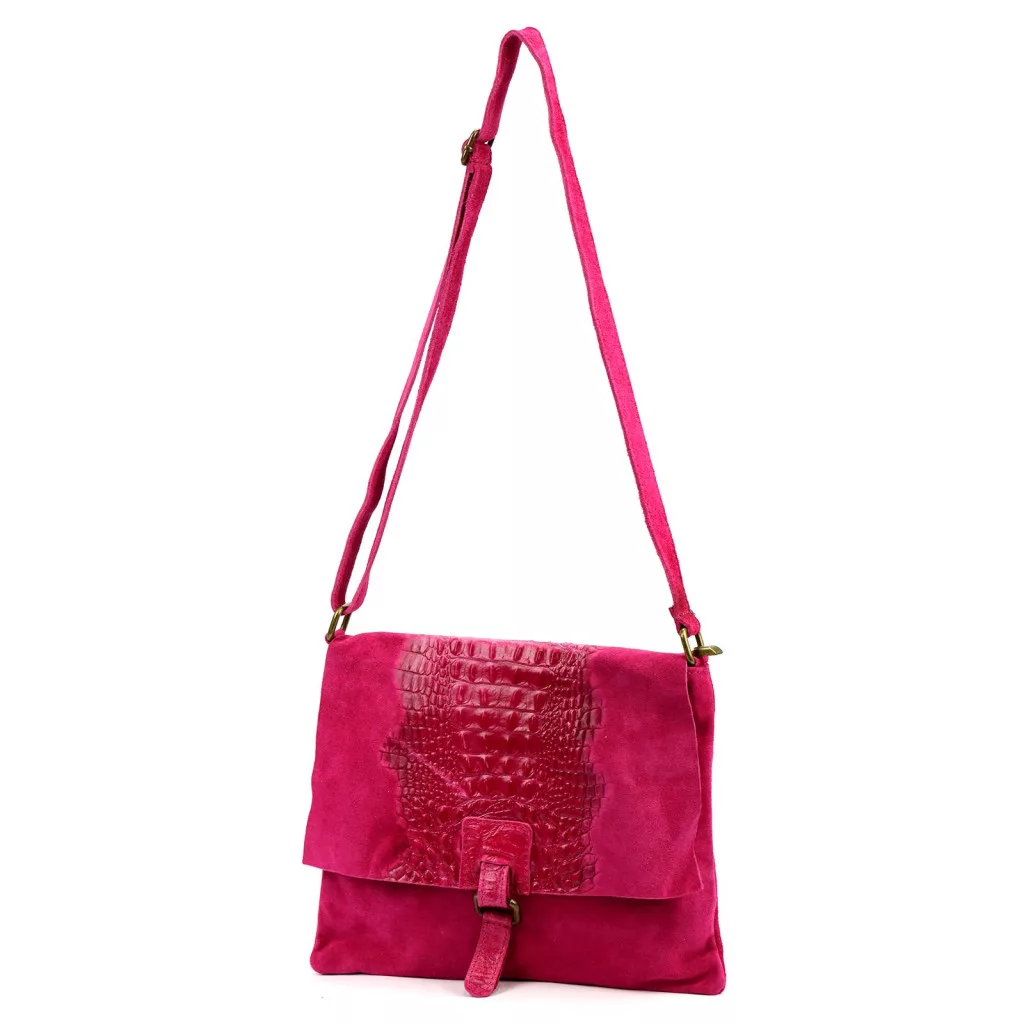 Nieduża torebka-listonoszka z najwyższej jakości, włoskiej, naturalnej skóry zamszowej. Skóra wyprawiana i barwiona wyłącznie naturalnymi garbnikami i barwnikami pochodzenia roślinnego i mineralnego. Na klapie torebki wytłoczono wzór skóry krokodyla. Torebka ma budowę jednokomorową, wykończoną trwałą podszewką, wyposażoną w kieszonkę zapinaną na suwak. Całość zamykana jest zamkiem błyskawicznym i klapą z zatrzaskiem magnetycznym. Długi pasek pozwala wygodnie nosić ją na ramieniu lub na ukos przez pierś.