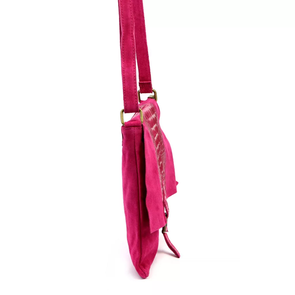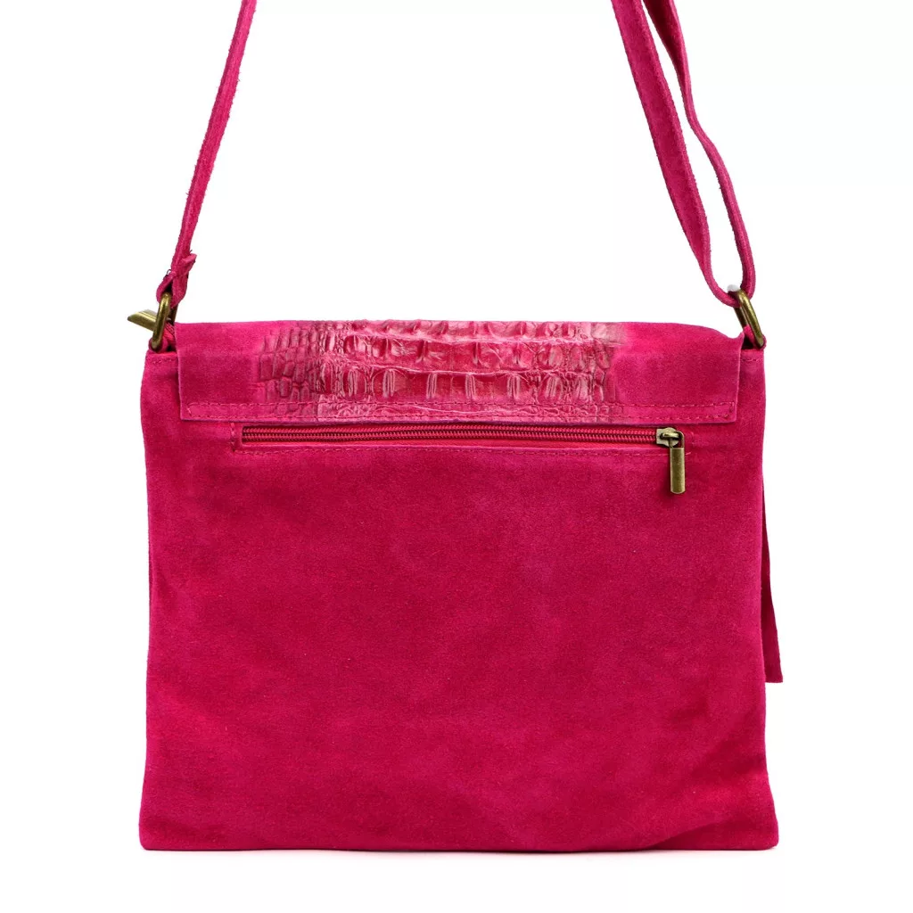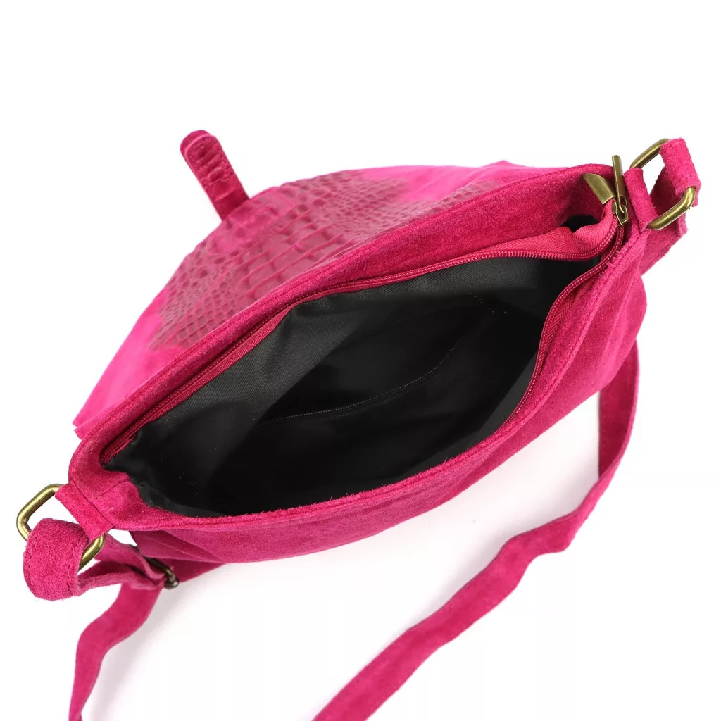 Nieduża torebka-listonoszka z najwyższej jakości, włoskiej, naturalnej skóry zamszowej. Skóra wyprawiana i barwiona wyłącznie naturalnymi garbnikami i barwnikami pochodzenia roślinnego i mineralnego. Na klapie torebki wytłoczono wzór skóry krokodyla. Torebka ma budowę jednokomorową, wykończoną trwałą podszewką, wyposażoną w kieszonkę zapinaną na suwak. Całość zamykana jest zamkiem błyskawicznym i klapą z zatrzaskiem magnetycznym. Długi pasek pozwala wygodnie nosić ją na ramieniu lub na ukos przez pierś.