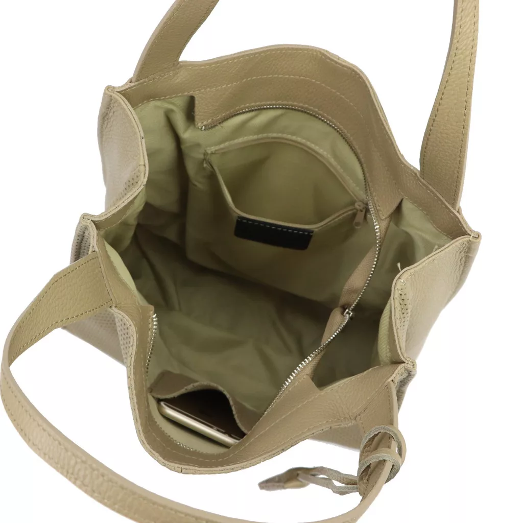 A táska prémium minőségű marhabőrből készült, amely tartós, ugyanakkor rugalmas és kellemes tapintású. A taupe szín a feng shui szerint a stabilitást, az egyensúlyt és a harmóniát jelképezi. A szürkés-bézs árnyalat természetes eleganciát sugároz, és könnyen kombinálható különböző stílusokkal.