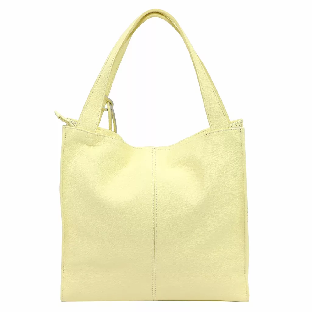 A Luka 26-099 DOLLARO halvány sárga női bőr kézitáska modern és letisztult megjelenésű darab, amely a minimalista stílust friss, világos árnyalattal ötvözi. Tágas kialakítása és puha esése kényelmes viseletet biztosít, miközben könnyed és nőies megjelenést kölcsönöz a mindennapok során.