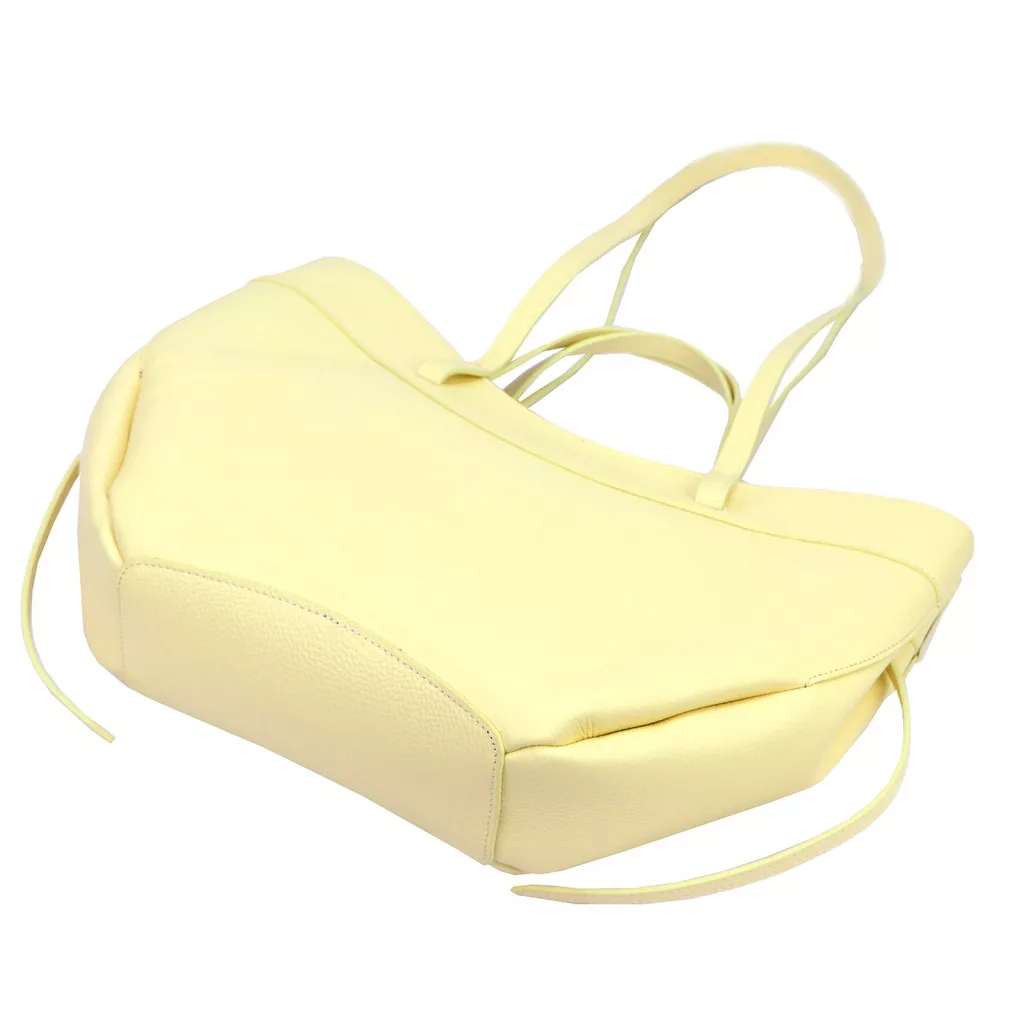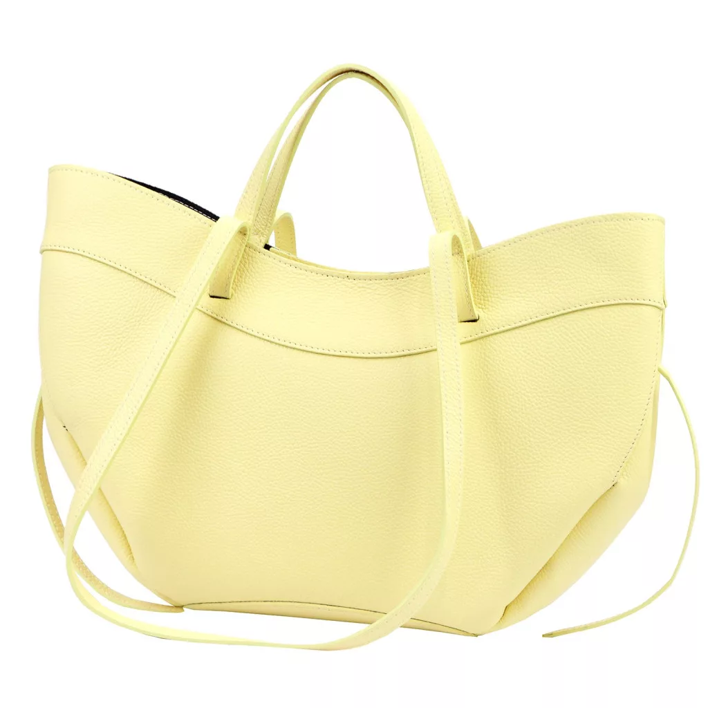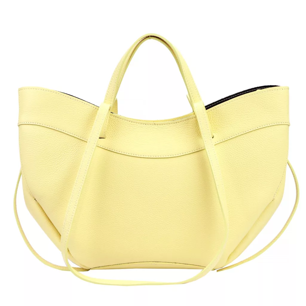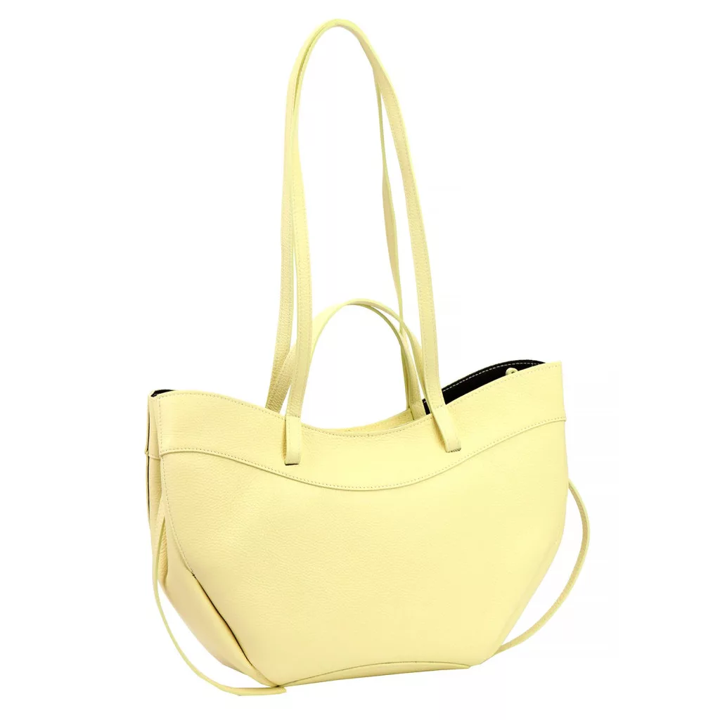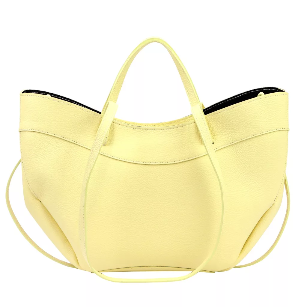 Modern, minimalista és nőies megjelenés. A táska különleges, enyhén ívelt és lágy vonalvezetésű fazonja elegáns sziluettet ad, miközben a finoman strukturált oldalak és a széles forma tágas belső teret biztosítanak. A pasztell sárga árnyalat friss és divatos karaktert kölcsönöz ennek a modern városi kézitáskának, amely tökéletes választás a stílusos mindennapokhoz.