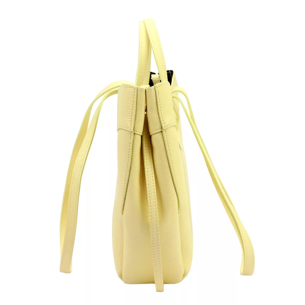 A Luka 25-025 pasztell sárga női bőr kézitáska elegáns és modern kialakításával a stílusos mindennapok praktikus kiegészítője. Tágas mérete és különleges formája ideálissá teszi városi használatra, miközben letisztult megjelenése kifinomult karaktert kölcsönöz az öltözéknek.