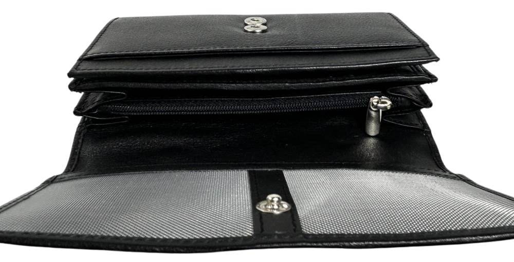 Má dve priehradky na papierové peniaze a 5 držiakov na karty. Vo vnútornej polovici sú tiež dve otvorené vrecká, ktoré sú vhodné aj na uloženie našich menších cenností. Na zadnej strane nájdeme väčšie otvorené aj uzavreté vrecko.