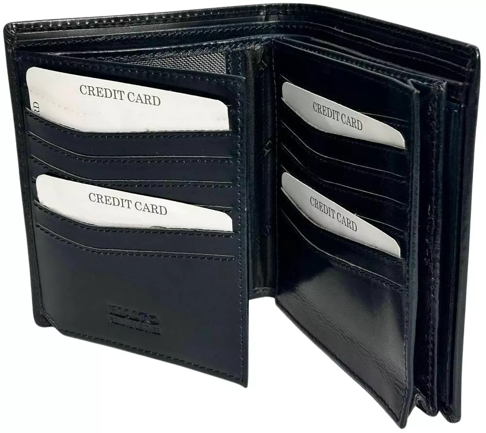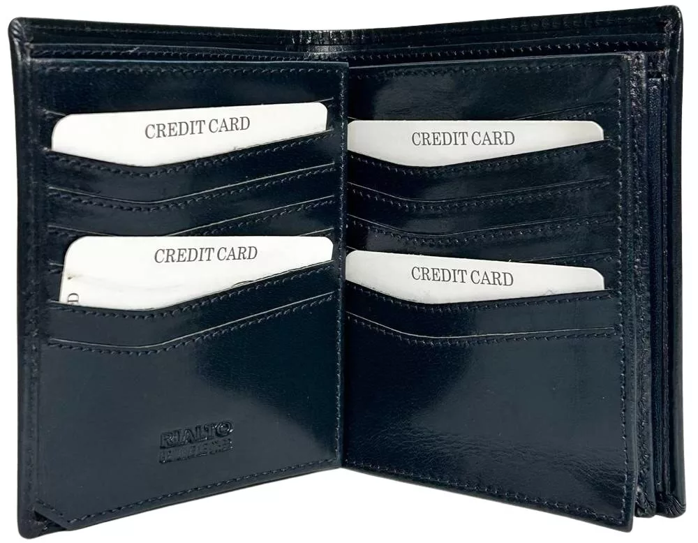 Patentovaný držiak na drobné, Držiak na papierové peniaze rozdelený na 2 časti , 21 vreciek na karty, 3 otvorené vrecká, Držiak na karty s 2 okienkami. Hodvábna podšívka zdobená značkou Rialto, na vonkajšej strane vytlačené logo Rialto.