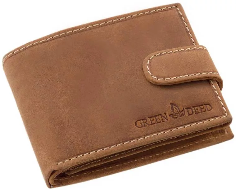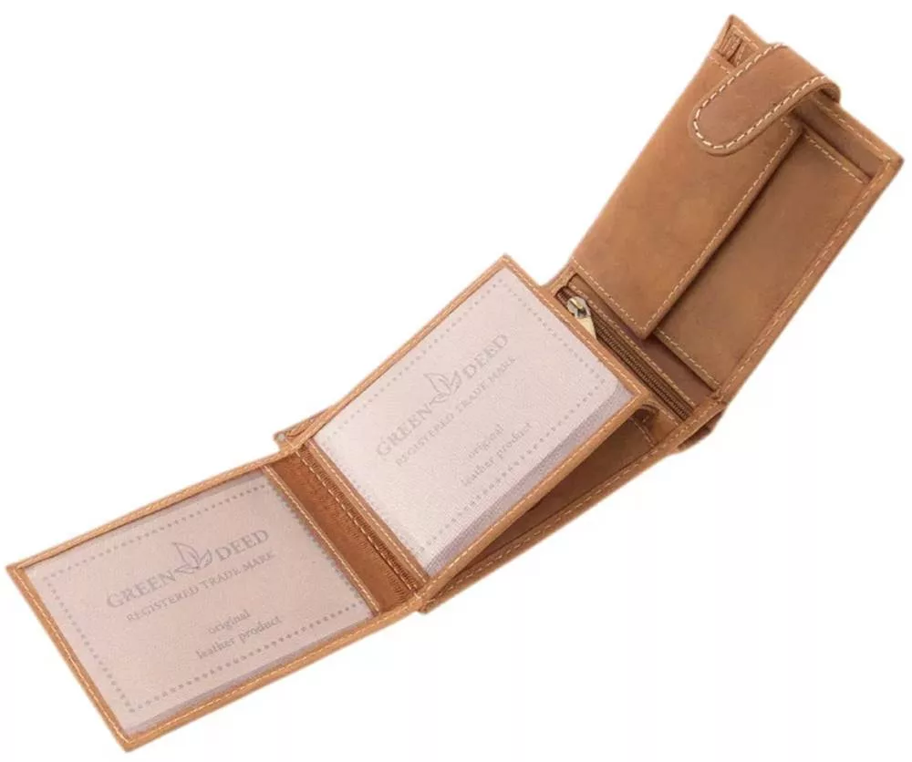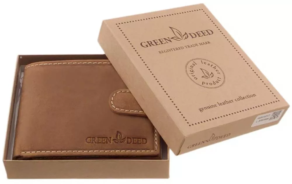 Peňaženka značky GreenDeed určená pre mužských rybárov, vyrobená z kvalitnej prírodnej hovädzej kože. Obal peňaženky sa vyznačuje špeciálnym dizajnom, detailnou kresbou sumca, ktorá je zvýraznená ozdobným prešívaním. Výrobok je možné uzavrieť praktickým vonkajším prepínacím pútkom. Peňaženka má dvojkomorový držiak na papierové peniaze, ktorý má aj ďalšie skryté vrecko na zips, malý držiak na drobné a niekoľko priehradiek na karty a doklady.