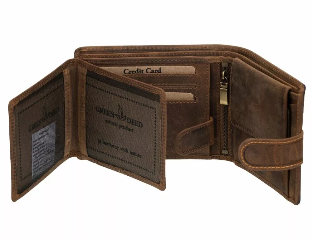 Peňaženka značky GreenDeed určená pre mužských rybárov, vyrobená z kvalitnej prírodnej hovädzej kože. Obal peňaženky sa vyznačuje špeciálnym dizajnom, detailnou kresbou sumca, ktorá je zvýraznená ozdobným prešívaním. Výrobok je možné uzavrieť praktickým vonkajším prepínacím pútkom. Peňaženka má dvojkomorový držiak na papierové peniaze, ktorý má aj ďalšie skryté vrecko na zips, malý držiak na drobné a niekoľko priehradiek na karty a doklady.