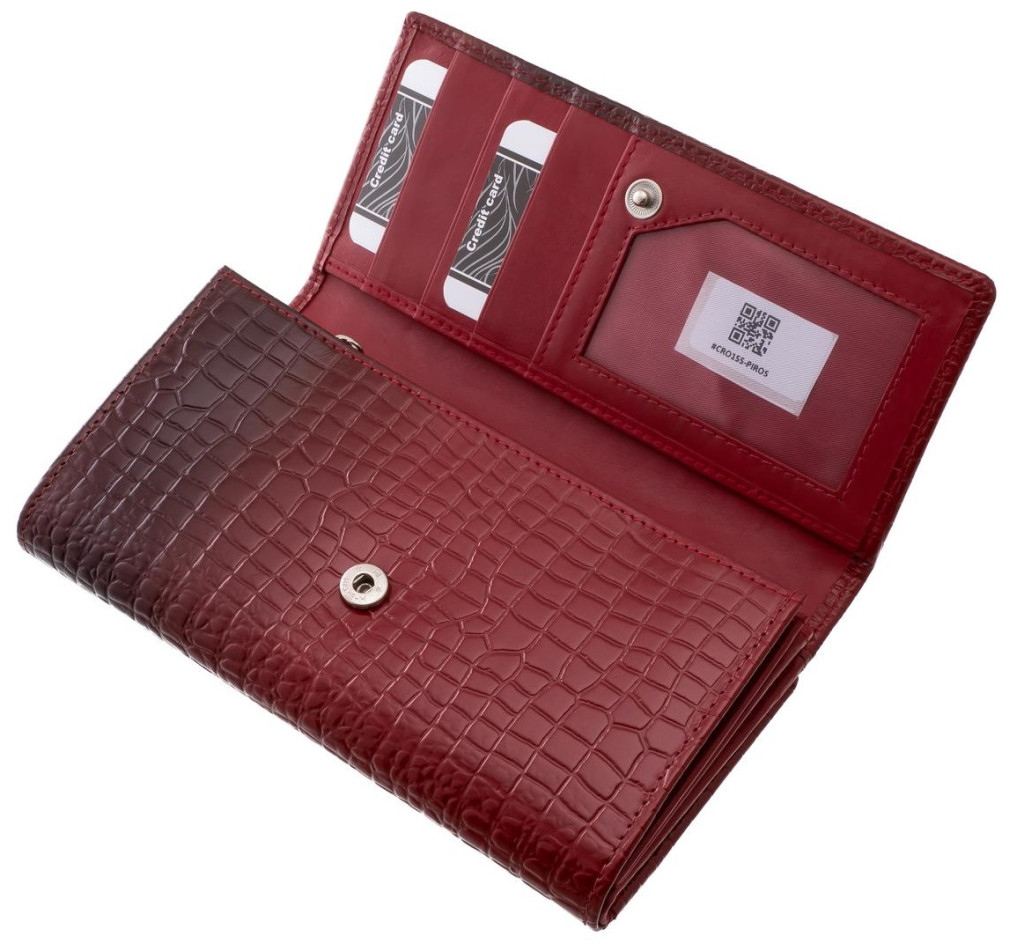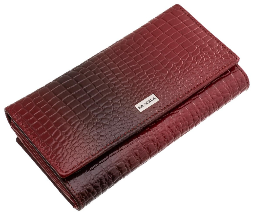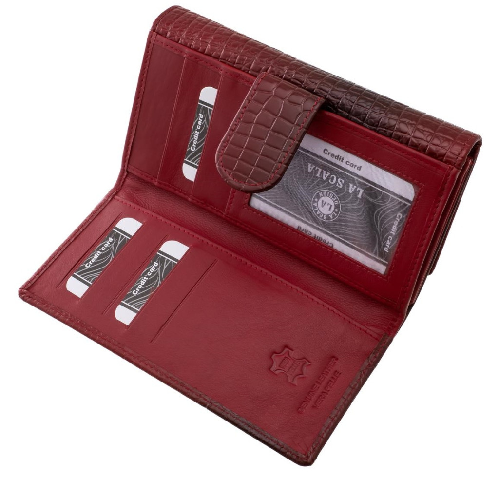 Dámska peňaženka z mäkkej napa kože so zapínaním na zips. Označené La Scala. S dvomi držiakmi na papierové peniaze a dvojdielnym držiakom na drobné, ktorý je uzatvárateľný na zips. Vnútri držiaky kariet a dokumentov, z ktorých jeden je uzatvárateľný na zips.