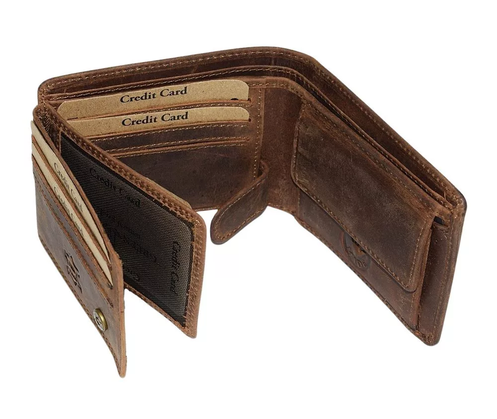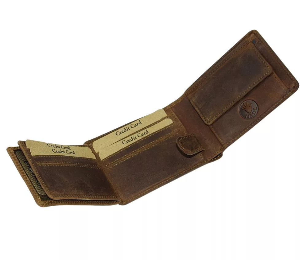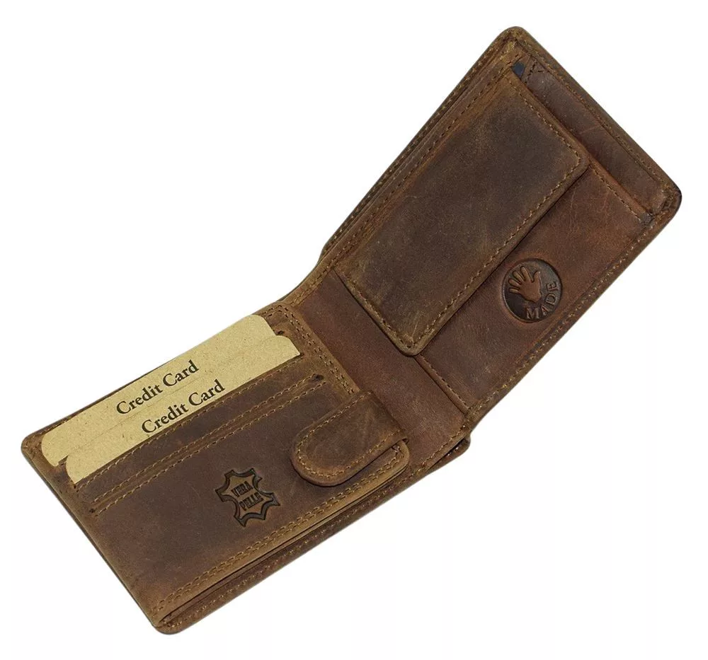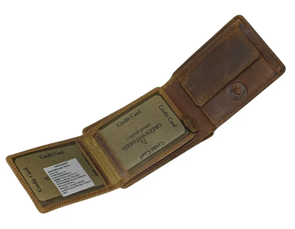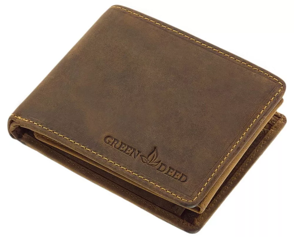 Špeciálna, čisto vyzerajúca hnedá pánska peňaženka s logom GreenDeed v darčekovej krabičke, vyrobená z pravej hovädzej kože s hodvábne jemným pocitom.