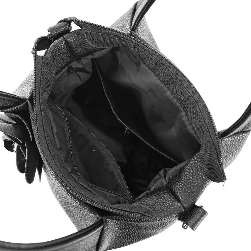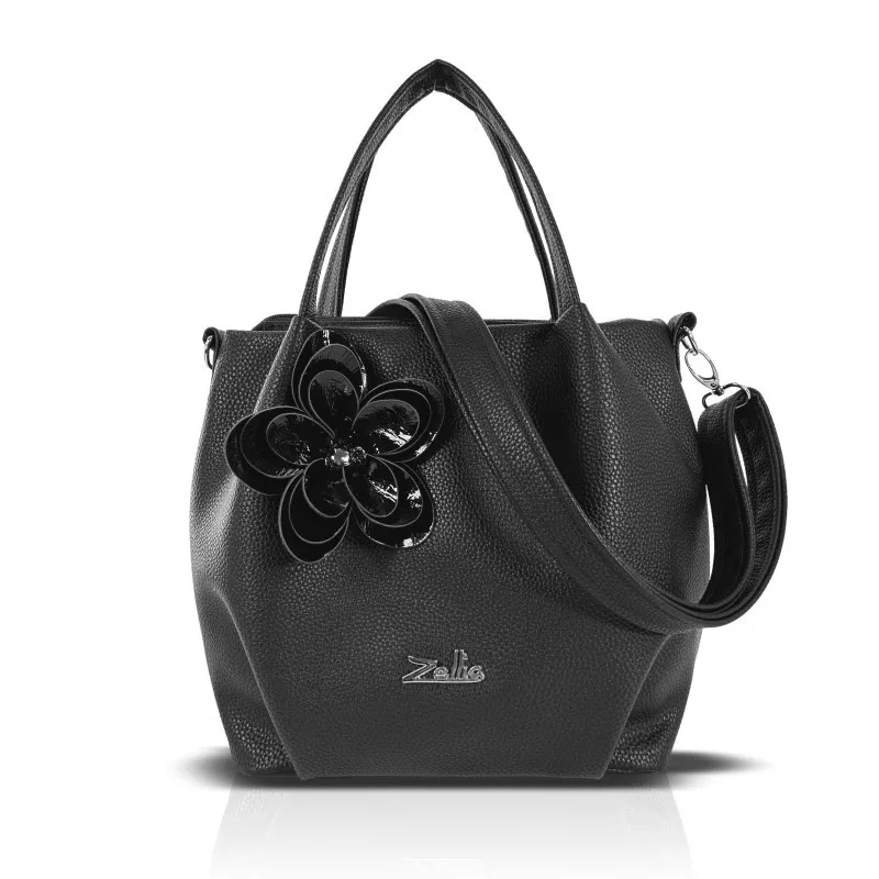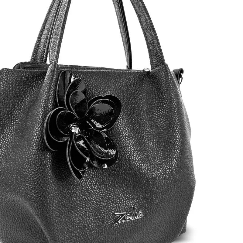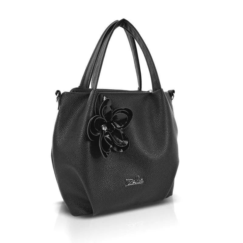 A Zellia ZLB324-F fekete női kézitáska virágdísszel elegáns és időtálló megjelenésével a mindennapok stílusos kiegészítője. A klasszikus fekete szín letisztult és sokoldalúan kombinálható, míg a táska elején elhelyezett virágdísz finom, nőies karaktert ad az összhatásnak.