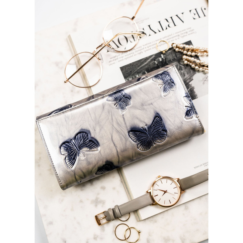 • Reliéfny vzor motýľa jemne zdobí striebornú pravú kožu, čím dodáva peňaženke elegantný a ženský vzhľad.