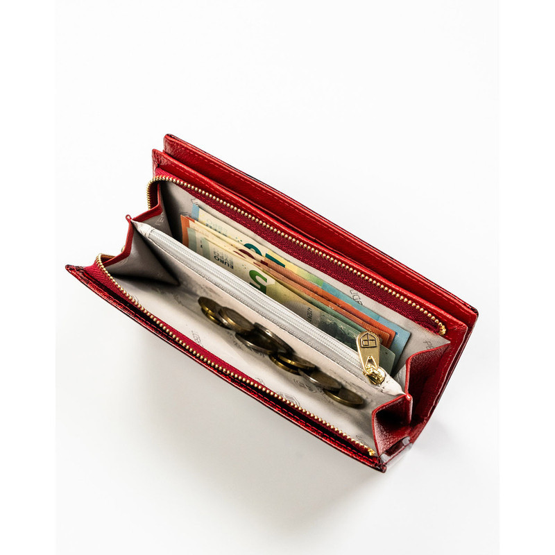 Čistite mäkkou, mierne vlhkou handričkou. Nepoužívajte chemikálie ani agresívne čistiace prostriedky. Skladujte na suchom a chladnom mieste, aby si vaša peňaženka dlho zachovala svoju žiarivú červenú farbu a krásu kvetinového vzoru.